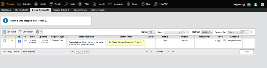 A ticket view after merging two tickets in SolarWinds Web Help Desk. (Image source).