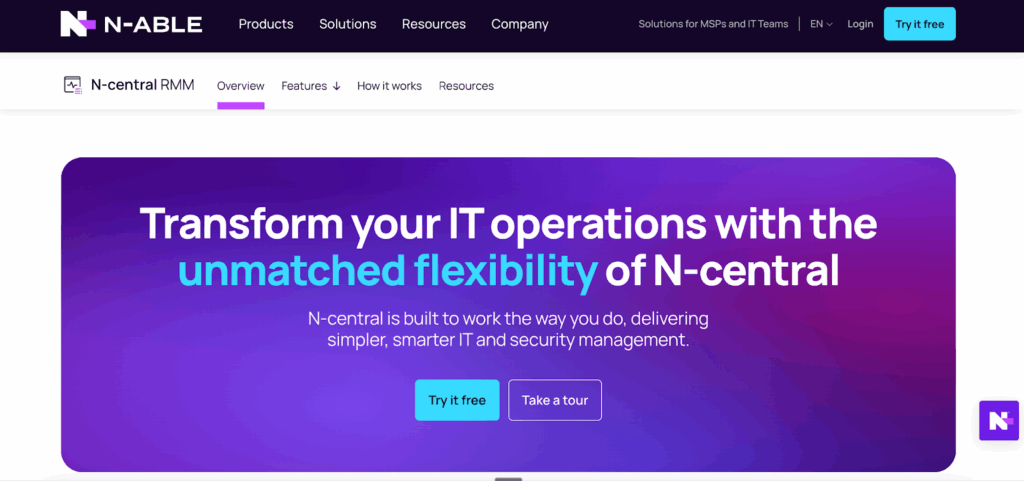N-able N-central focuses heavily on security alongside RMM capabilities with endpoint management, integrated EDR and vulnerability scanning, and backup options.