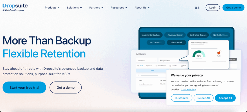 DropsuiteCompliance-focused MSPsFlat pricing, audit trails, point-in-time restoresLess granular recovery, limited MSP dashboards4.4