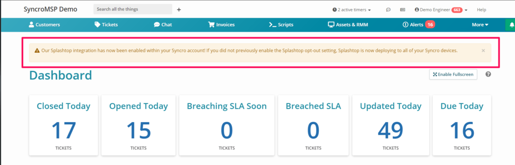 Our new Splashtop functionality is now ready for release! Please note that we are rolling out Splashtop as a limited deployment for our users over the next couple of weeks. This means that a small amount of folks will have access to it today, and we’ll slowly increase that number over the course of the next several days until it’s live on all Syncro accounts. We’ll be notifying you when it’s live on your specific Syncro instance through an in-app notification that looks like this: