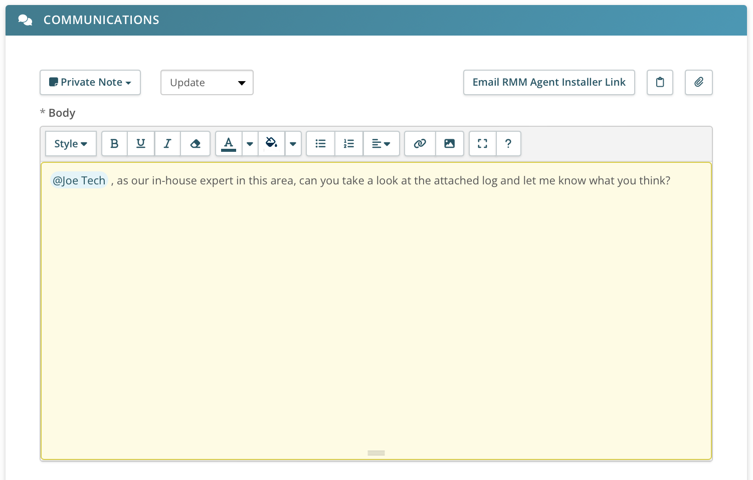 Technicians can mention others within ticket communications. This feature can be used in two ways: