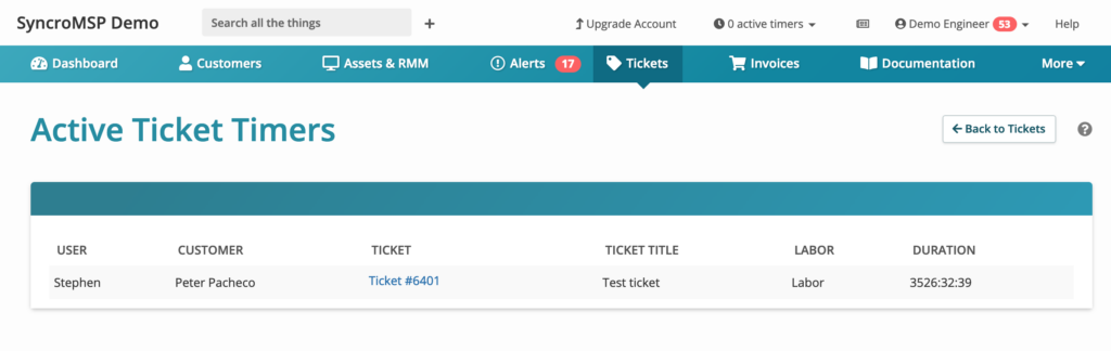 We’ve added a new page that allows you to see all the currently active ticket timers that you have running, giving you greater visibility on what is being worked on and for how long.