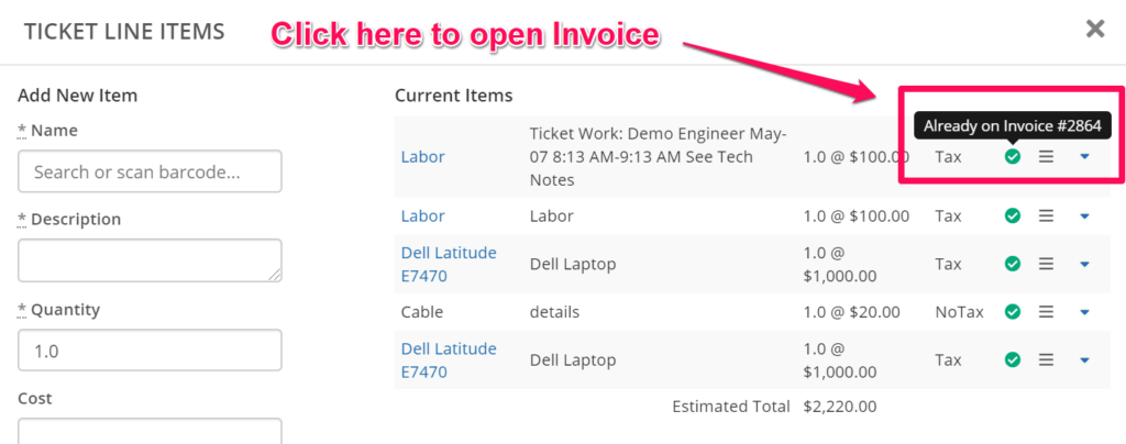 Now, when you look at the Ticket Line Items modal on a Ticket, the green check-mark next to each Ticket Charge is clickable and takes you directly to the Invoice that the charge was placed on. You can also hover over this check-mark in order to see the Invoice number as well!