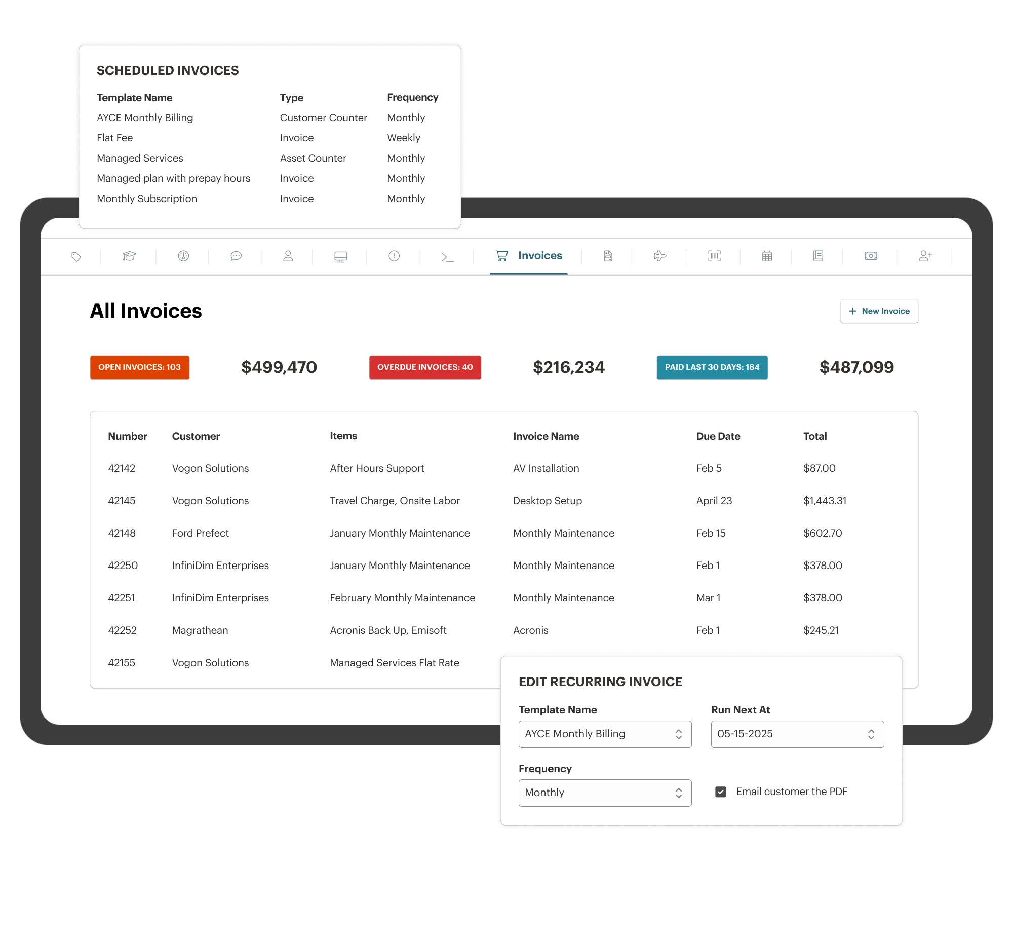 Syncro automates your financial workflow, from tracking real-time seat counts to generating complex recurring invoices, ensuring that every task performed is accurately accounted for and billed without manual auditing.