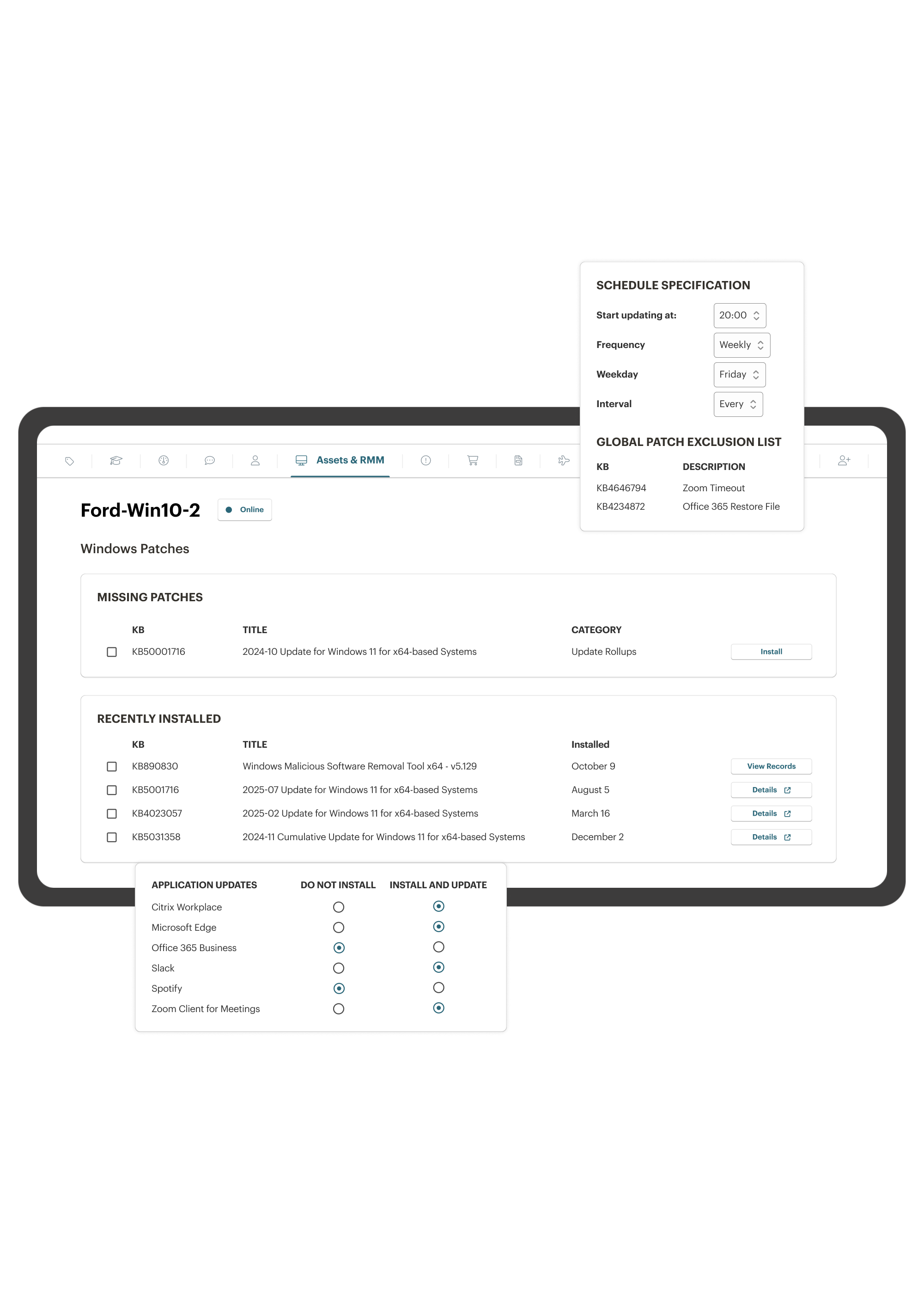 Keep systems up-to-date with the latest security patches and updates to reduce vulnerabilities and ensure compliance. Create regular patching schedules, decide which updates to install or block, and get reports detailing any vulnerable systems.