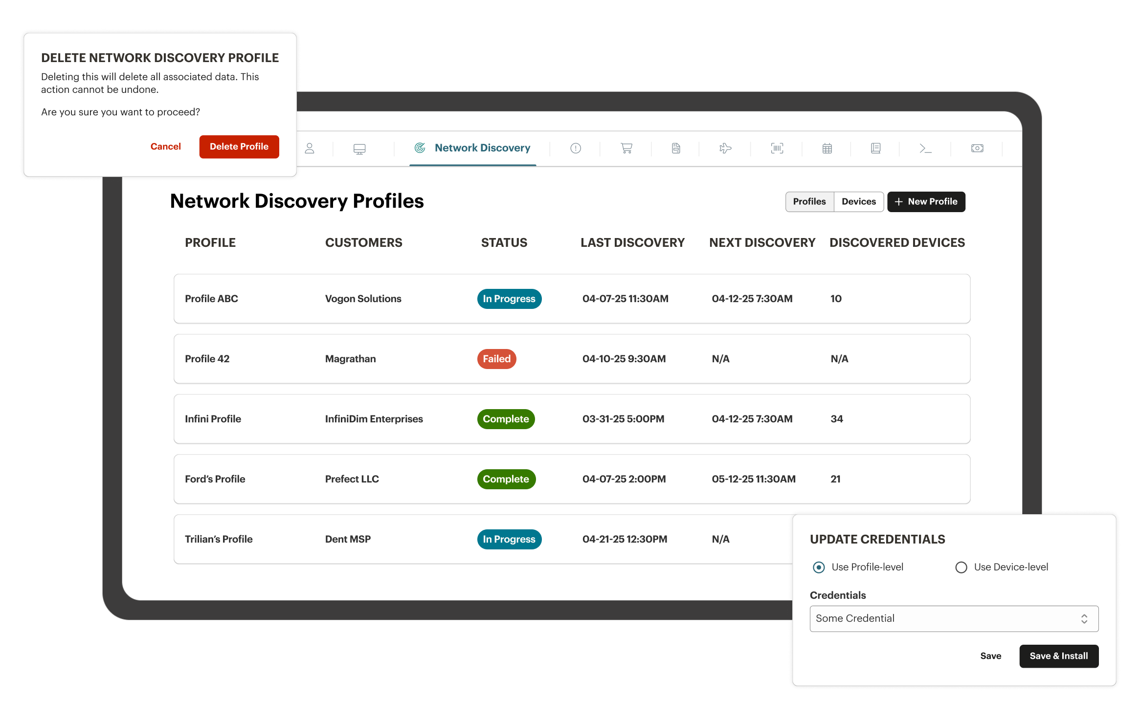 Create a discovery profile, run and schedule network scans, receive real-time notifications, and view all discovered devices in an organized list that automatically refreshes.