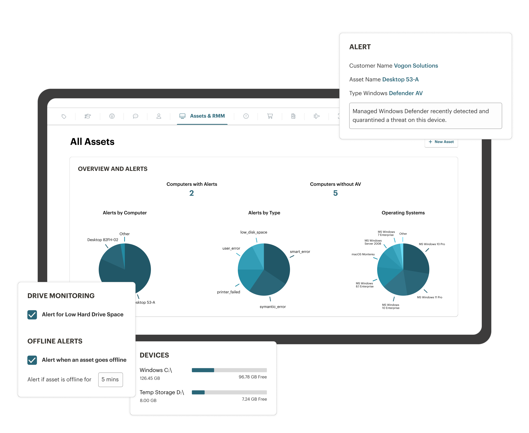 Syncro gives you a single source of truth for your entire distributed device landscape. Maintain total visibility over hardware health and asset inventory at scale, or zoom in on a single endpoint to solve issues in real-time.